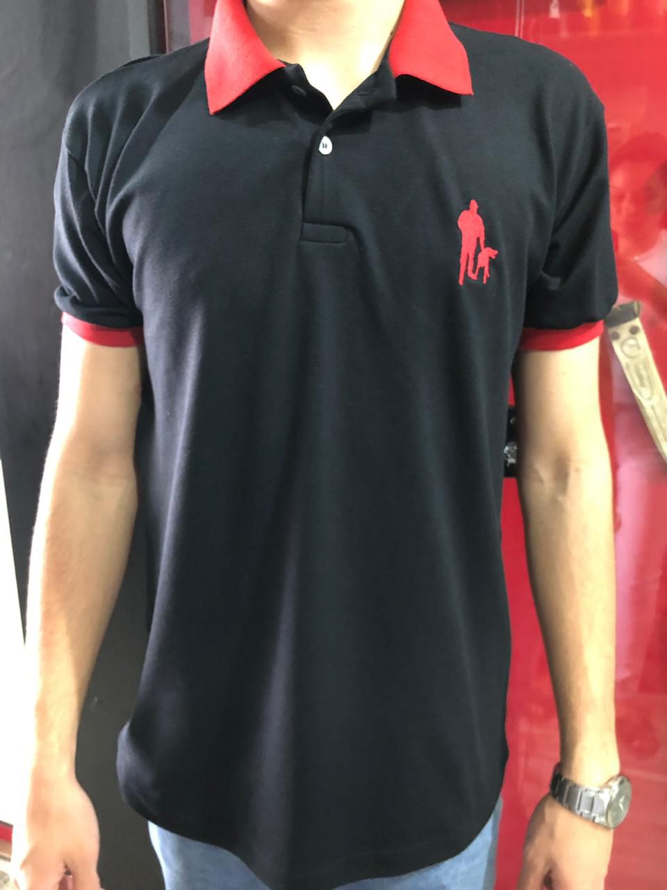 Camiseta Gola Polo Preta com Vermelho Caçador