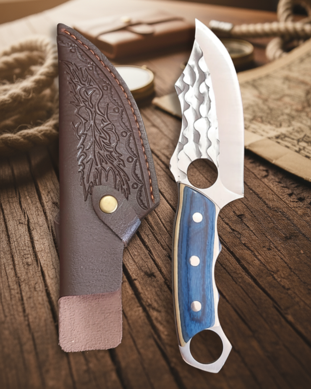 Bainha de Couro Artesanal: Acompanha uma bainha de couro legítimo, ricamente trabalhada com detalhes em relevo que remetem à natureza e à arte da caça. Além de proteger a lâmina e garantir a segurança no transporte, ela adiciona um toque rústico e autêntico ao conjunto. O fecho em botão de latão assegura que a faca permaneça segura.